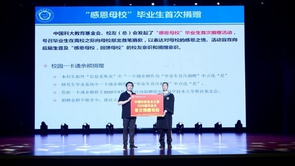晚会现场,2016级本科生龚庭楠同学作为代表,将2020届毕业生的首次捐赠交到教育基金会秘书长周宇老师手中,表达了毕业生们对母校的感恩之情。自2011年起,中国科大教育基金会和校友总会发起了“感恩母校”毕业生首次捐赠活动,号召毕业生在离校之际向母校献出首笔捐款。