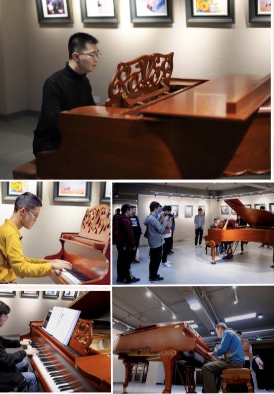 一首欢快优美的钢琴独奏《向阳花》为本次画展拉开了序幕,参加活动的老师与同学们在展览现场认真参观,亲切互动。展厅内优美的琴声不绝于耳、前来参观的同学更是络绎不绝。