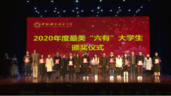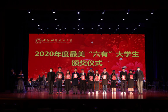 音乐会现场举行了2020年度最美“六有”大学生颁奖仪式。校党委书记舒歌群、校长包信和,各院系相关负责老师共同为获奖同学颁发荣誉证书和奖杯,勉励受表彰的同学再接再厉,希望全校同学以他们为榜样,努力成长为“有理想、有追求,有担当、有作为,有品质、有修养”的“六有”大学生。