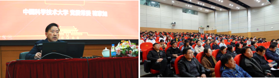 褚家如首先介绍了党的十九届五中全会的基本情况,重点阐述了《中共中央关于制定国民经济和社会发展第十四个五年规划和二〇三五年远景目标的建议》的核心要义、主要内容,传达了“十四五”规划和“二〇三五年远景”对高校科技和人才培养工作的新要求。他简要介绍了“十三五”期间我国建设发展情况,强调要准确把握决胜全面建成小康社会取得决定性成就;从“进入新发展阶段”“贯彻新发展理念”“构建新发展格局”三个“新”出发,他强调要准确把握《建议》的核心要义;从未来发展宏图与指导思想出发,强调要遵循“五个坚持”原则,阐述了“十四五”的主要目标与重点任务;从“十四五”重点任务第一项“坚持创新驱动发展,全面塑造发展新优势”切入,褚家如指出,要找出实现科技“自立自强”中亟待解决的问题,并阐述《建议》中关于科技工作的新部署,传达习近平总书记对中国科大的嘱托,介绍为实现“潜心立德树人”和“执着攻关创新”所开展的各项工作。