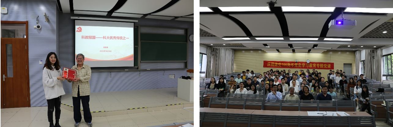 为庆祝中国共产党建党100周年,深入学习贯彻落实习近平总书记关于中国科大系列重要指示精神,加强师生对党史校情的了解,进一步学习和弘扬老一辈科学家精神,5月26日下午,环境科学与工程系党总支邀请了我校关工委委员韩荣典教授在2105教室作“科教报国——科大优秀传统之一”专题党课辅导报告。环境科学与工程系全体师生参加了此次报告会,报告会由系党总支书记张文真主持。