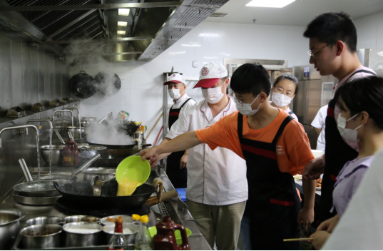 餐厅经理带着队员们进入后厨近距离观看食堂大厨烹饪过程,并学习无锡酱排、锅包肉、丝瓜炒毛豆米等菜品的制作方法,师傅们精湛的厨艺让支教队员们纷纷点赞。