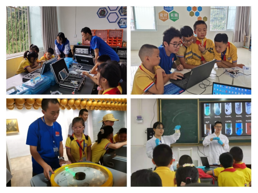 营员们分为趣味木工、开源电子、3D打印、趣味编程和机器人等5个兴趣小组,跟随每组指导活动的科大实践服务团团员到指定教室开展活动。在为期三天的小学教学活动中,团员们结合五星红旗、建党百年等红色元素与第六小学少年硅谷创客中心的实际条件,在了解营员的兴趣与大致水平之后,对科创活动的内容与形式进行顶层设计和具体指导,很好地调动了营员的积极性,帮助营员们从小树立起爱国爱党的信念。在六枝特区科技馆,团员们用通俗易懂的语言普及各类科学展示实验的原理,激发小朋友们对科学的好奇心与求知欲。