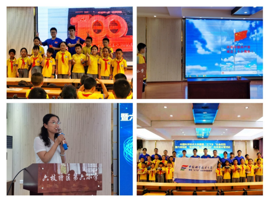 7月20日上午,服务团来到了六枝特区第六小学,参加“童心向党 科技筑梦”科技夏令营开营仪式。参与开营仪式的有中国科大定点帮扶办公室主任李俊,六枝特区政府党组成员、中国科大挂职干部林高华,中共六枝特区委员会党校常务副校长、六枝特区教育局局长蔡洪江,六枝特区第六小学校长欧春和来自六枝特区各小学的营员们。开营仪式上,林高华鼓励“三下乡”实践服务团团员与参加夏令营的小学生们,希望大家互相学习、共同进步,共同感受科学的魅力。邵祎康代表实践服务团发言,鼓励团员们充分发扬中国科大“红专并进 理实交融”的精神,激发小朋友们对科技的兴趣。林高华、蔡洪江等为中国科大的同学们颁发聘书,夏令营正式开营。