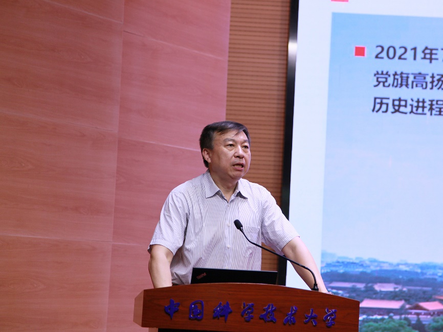 舒歌群指出,习近平总书记“七一”重要讲话宣示了实现第一个百年奋斗的目标,明确了实现为中华民族伟大复兴的主题,宣告了我们党创造的四个伟大成就,提出了坚守真理、坚守理想,践行初心、担当使命,不怕牺牲、英勇斗争,对党忠诚、不负人民的伟大建党精神。以史为鉴,开创未来,我们必须坚持“九个必须”,牢牢把握新征程党和国家各项事业的前进方向,积极响应党中央向全体党员发出的伟大号召,牢记初心使命,坚定理想信念,努力为党和人民争取更大光荣。舒歌群介绍了中国科大诞生的历史背景和我校不同建设时期在人才培养、科学研究方面取得的巨大成果,并指出中国科大作为一所为了党和国家的重大战略需要而诞生的新型大学,受到了党和国家的大力支持,她的诞生和发展是党领导高等教育成就的缩影。舒歌群强调,未来我们要建成世界一流大学,必须心怀国之大者,服务政治大局,始终牢记新时代教育培养什么人、怎样培养人、为谁培养人的根本问题,坚持马克思主义指导地位,贯彻习近平新时代中国特色社会主义思想,坚持社会主义办学方向,落实立德树人根本任务,坚持“四个服务”根本宗旨,构建卓越人才教育体系,贯彻三全育人理念,落实五育并举要求,大力提升本科生、研究生培养质量和水平,努力培养担当民族复兴大任的时代新人,培养德智体美劳全面发展的社会主义建设者和接班人。在科学研究方面,要聚焦“四个面向”,构建卓越创新体系,深刻认识国家战略科技力量的内涵,围绕研发战略性产品、攻克战略性产业关键核心技术、抢占未来战略必争领域制高点等国家最紧迫的战略性问题执着攻关创新,实现高水平的科技自立自强。