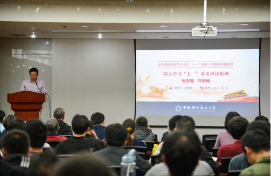 2021年10月12日下午,中国科学技术大学党委常委、副校长罗喜胜在西区科技实验楼报告厅以“悟原理,开新局”为题,作学习贯彻习近平总书记“七一”重要讲话精神宣讲,来自国家同步辐射实验室、核科学技术学院、火灾国家重点实验室、工程科学学院的师生代表200余人聆听了报告。宣讲会由国家同步辐射实验室党委(核科学技术学院党委)书记李良彬主持。