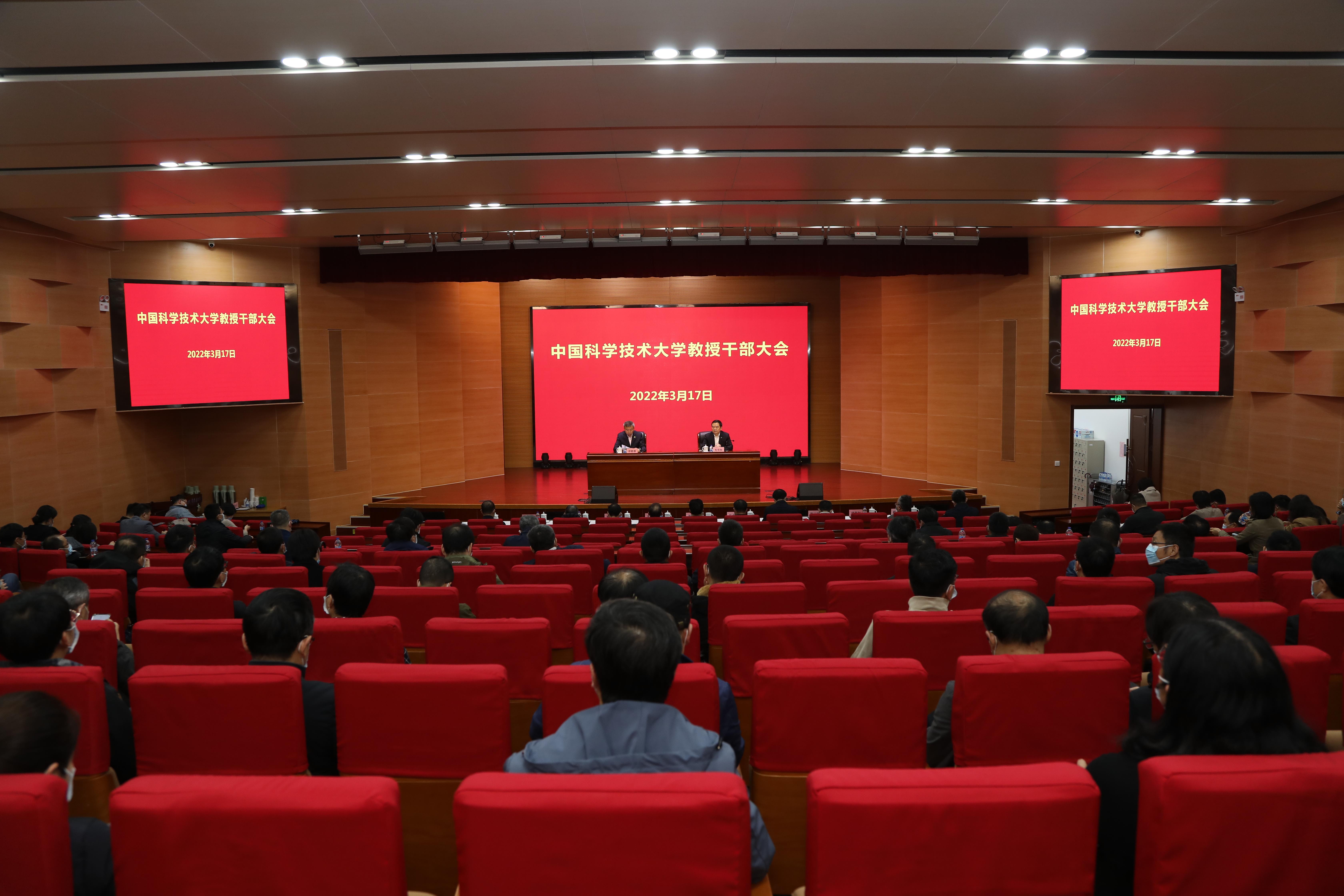 3月17日上午,中国科大在东校区水上报告厅召开教授干部大会,传达学习习近平总书记重要讲话和全国两会精神。校党委书记舒歌群主持会议并讲话。校长包信和,在校校领导、两院院士、教授及相当专业技术职务人员,校学术、学位、教学委员会委员,校党委、纪委委员,各学院、系、重点科研机构、机关各部门、直属单位党政负责人,全国、安徽省人大代表、政协委员,各民主党派负责人参加会议。