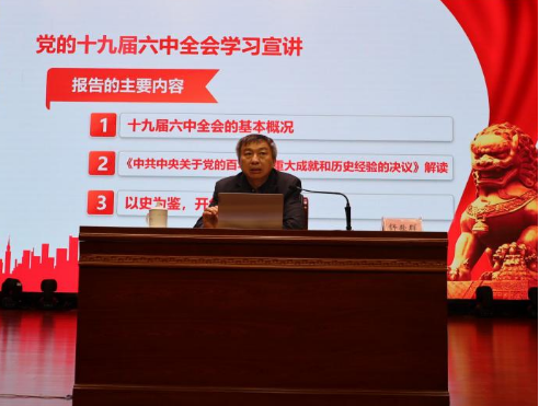 开班仪式后,舒歌群为学员作题为《回首百年成就 迈向更大辉煌——党的十九届六中全会精神学习宣讲》的专题报告。他首先强调了深入学习党的十九届六中全会精神的重要性,接下来从党的十九届六中全会基本概况、《中共中央关于党的百年奋斗重大成就和历史经验的决议》解读、“以史为鉴,开创未来”三个方面进行了详细阐述。期望学员们认真深入学习党的十九届六中全会精神,更加紧密团结在以习近平同志为核心的党中央周围,以史为鉴、开创未来,埋头苦干、勇毅前行,为实现第二个百年奋斗目标、实现中华民族伟大复兴作出新的更大贡献。