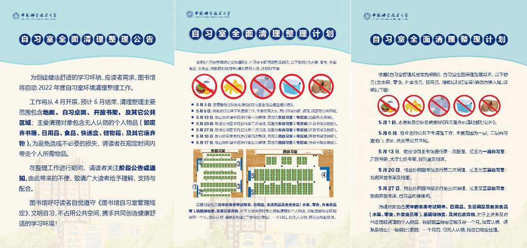 依据《自习室全面清理整理计划》,为让读者有充足的时间转移开放书架上的个人物品,整项工作采用分区域分阶段的方式逐步实施。每一阶段开始前,提前一周张贴阶段公告,告知读者下一阶段重要内容;每一阶段结束时,立即张贴“温馨提醒”,告知读者可充分使用已被释放且经消毒处理的开放书架空间资源。