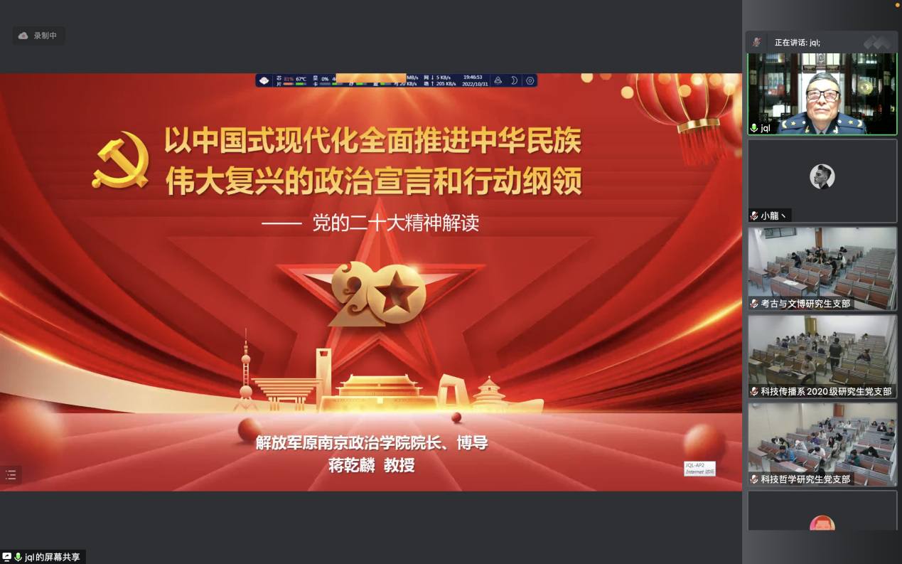 为深入学习贯彻党的二十大精神,10月31日晚,人文与社会科学学院邀请解放军原南京政治学院院长、空军少将蒋乾麟教授作题为《以中国式现代化全面推进中华民族伟大复兴的政治宣言和行动纲领——党的二十大精神解读》的专题报告。在做好各项疫情防控措施的前提下,人文学院分别在南校区和东校区设立多个分会场,学院全体师生党员通过线上线下相结合的方式参加学习。报告会由人文与社会科学学院党委书记褚建勋主持。