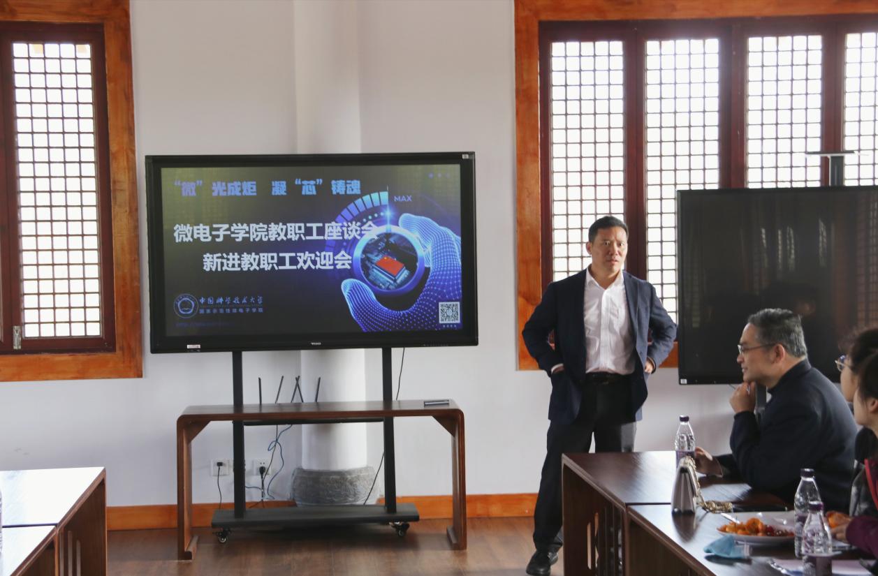 在教职工座谈会上,执行院长龙世兵总结了今年学院在人才引进、科研创新、实验平台以及高新园区建设等方面所取得的成绩,并希望全体教职工继续以饱满的工作热情、良好的精神状态、务实的工作作风,立足岗位、凝心聚力,在新形势新要求下实现新作为,努力建成一流国家示范性微电子学院。随后,学院副院长程林、院长助理张旭、办公室主任蔡伟分别介绍了研究生培养、本科生培养、办公场地建设等相关事宜。
