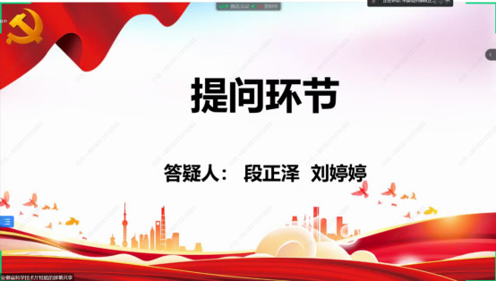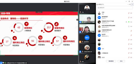 在互动交流答疑环节,段正泽校友和刘婷婷校友就笔试、面试的时间分配,申论材料的答题方法、安徽省公务员的薪资待遇等大家关注的问题进行了认知细致的解答。参会同学通过会议聊天区和两位校友进行了积极充分的互动,两位校友还结合自身工作实际和备考经验,向同学们提出了切实可行的建议。