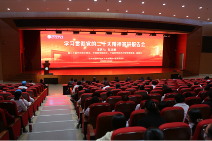 12月8日下午,第二十届中央候补委员、校党委常委、副校长、中科院学习贯彻党的二十大精神宣讲团成员、学校学习贯彻党的二十大精神宣讲团成员杜江峰作学习宣传贯彻党的二十大精神宣讲报告。报告会由中国科学院南京分院党组书记朱怀诚主持。