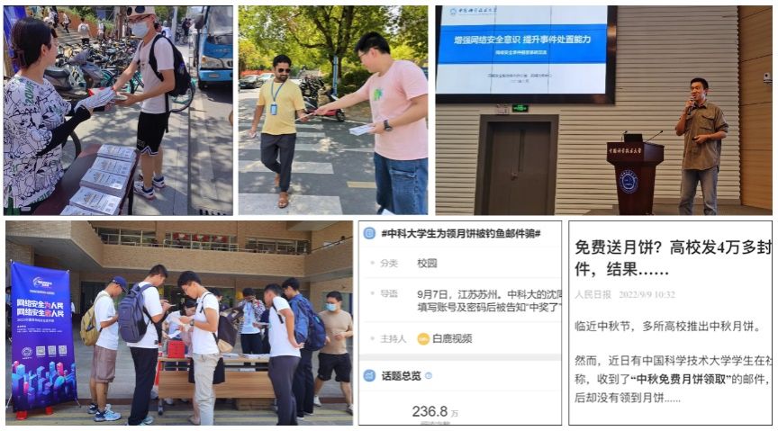 在网络安全周期间,针对校内钓鱼邮件事件频发及师生安全意识不足的情况,网络信息中心联合网络安全和信息化办公室、网络空间安全学院及Linux用户协会围绕师生关心的中秋月饼话题,精心策划组织了钓鱼邮件演练活动。活动引起校内师生的极大关注,在社交网络引发热议,并被中国教育网络、共青团中央微信公众号、中国青年报等多家媒体正面报道,取得了良好的宣传效果。