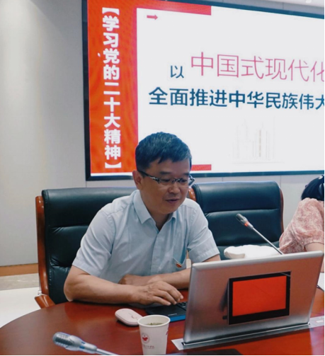 人力资源部党支部书记、人力资源部部长、党委教师工作部部长陈卫东领学党的二十大报告中教育、科技、人才相关论述,并以《学习党的二十大精神,以中国式现代化全面推进中华民族伟大复兴》为题作学习贯彻习近平新时代中国特色社会主义思想主题教育专题党课报告。他从“推进中国式现代化要深刻把握中国式现代化的科学内涵和本质要求”“推进中国式现代化要始终坚持将高质量发展作为实现目标的金钥匙”“推进中国式现代化要始终保持新时代踔厉奋发勇毅前行的精神状态”等方面深入解读了中国式现代化,希望全体党员要以高度的政治自觉,持续学深悟透,入脑入心,见行见效,为实现以中国式现代化全面推进中华民族伟大复兴的宏伟蓝图贡献智慧和力量。
