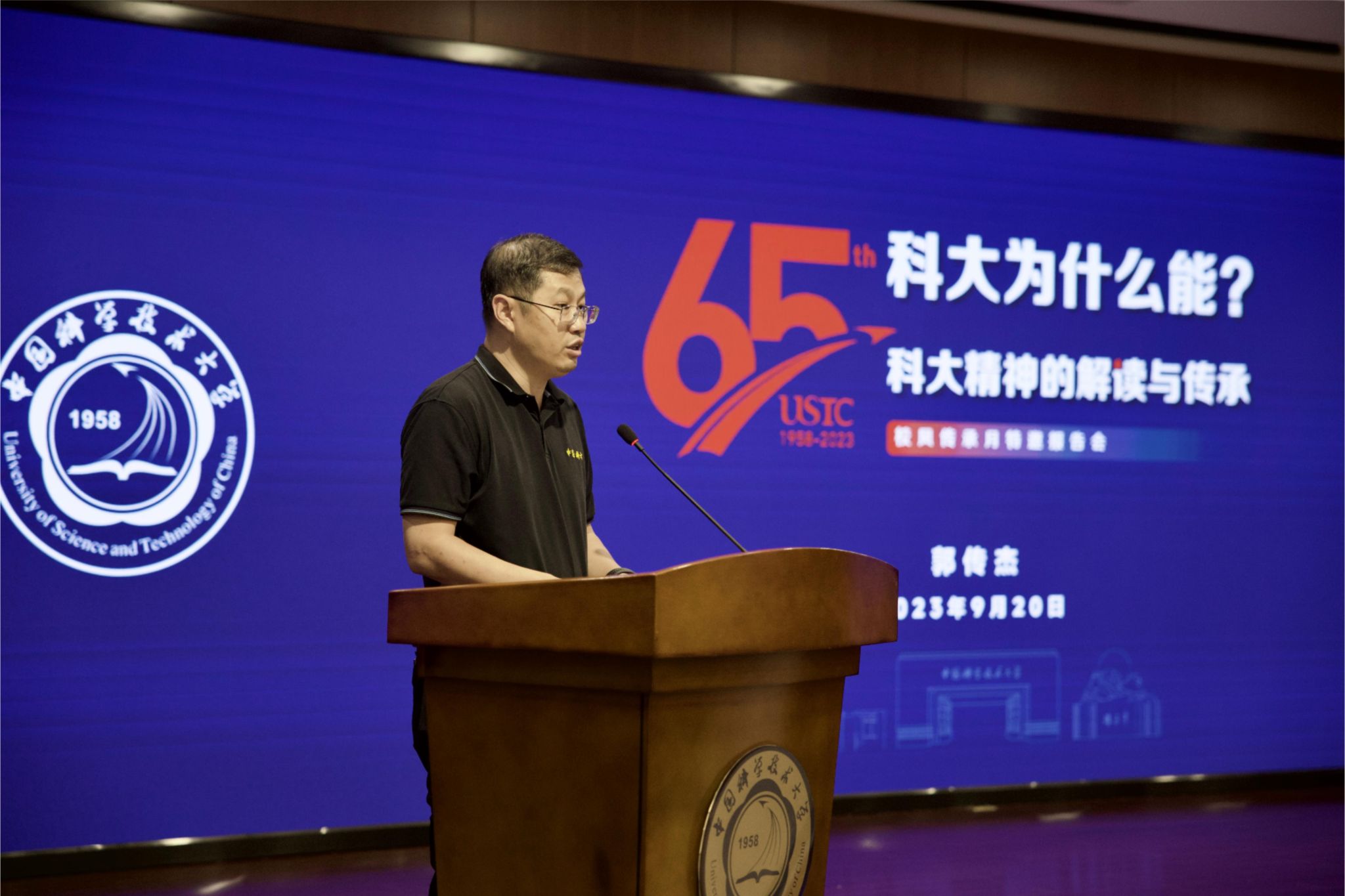 9月20日下午,为增进广大师生对科大精神的理解,引导广大师生传承优良校风,营造热烈的校庆氛围,学校特别邀请中国科学院原党组副书记、中国科大原党委书记郭传杰,于建校65周年纪念日当天,在东活五楼报告厅作题为《科大为什么能?——科大精神的解读与传承》的报告。校党委副书记、纪委书记、国家监委派驻监察专员毕金初出席报告会,校党委副书记邓建松主持报告会。院级党组织书记,机关部门、直属单位负责人,教师代表、学生代表参加本次报告会。