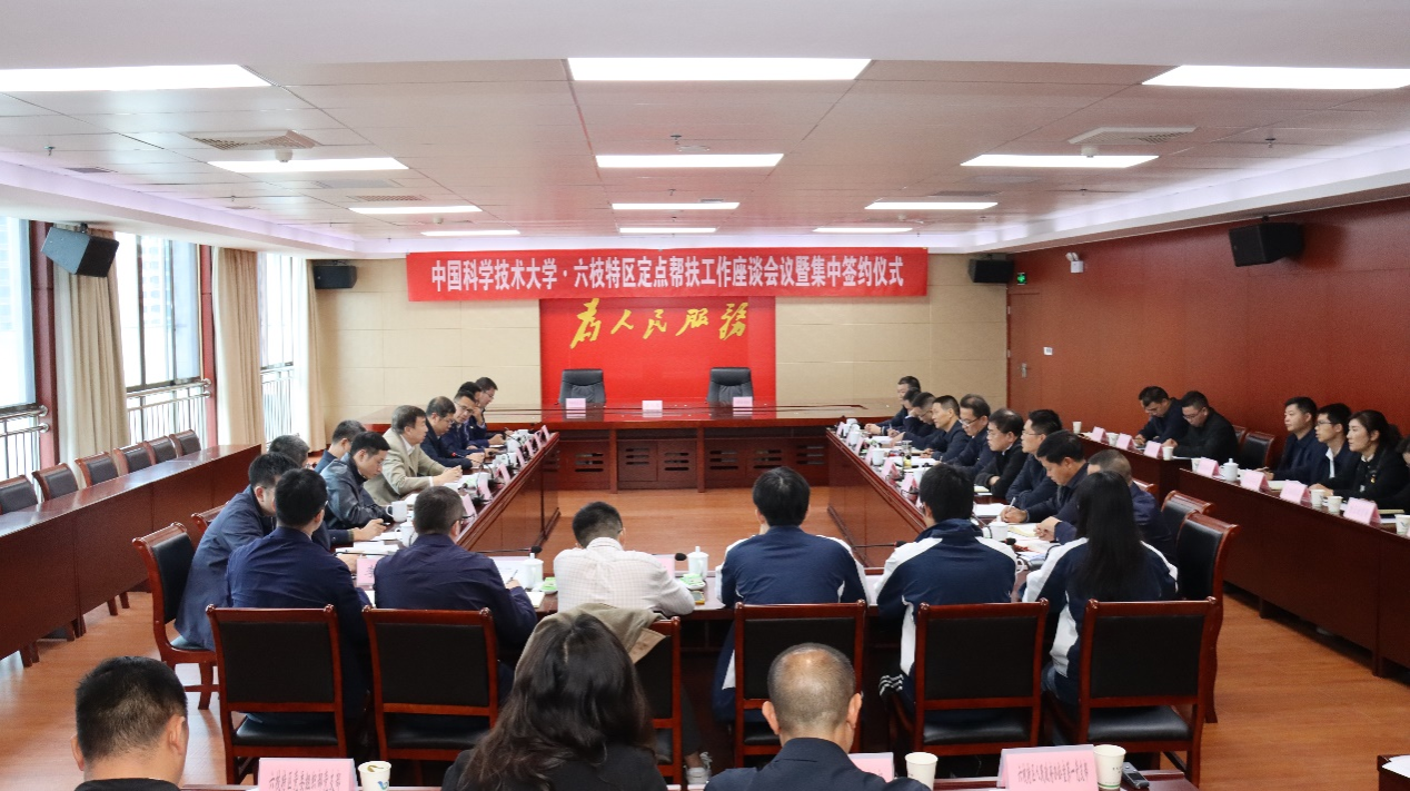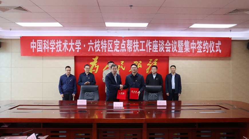 在舒歌群、方裕谦、鲍吉克等领导的见证下,邓建松代表学校签署《“百校联百县兴千村”行动暨校县合作协议》《中国科学技术大学协助六枝特区招商引资合作协议》;中国科大党政办公室党支部、组织部统战部党支部、科研部党支部、先进技术研究院机关党支部、资产经营有限责任公司直属党支部分别与六枝特区人民政府办公室第一党支部、党委组织部党支部、科学技术协会党支部、经济开发区机关第一党支部、招商投资促进服务中心党支部等签署结对共建协议,并捐赠了图书。