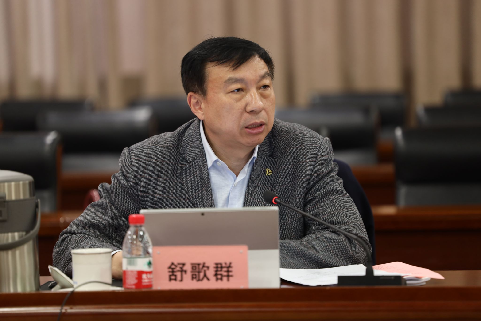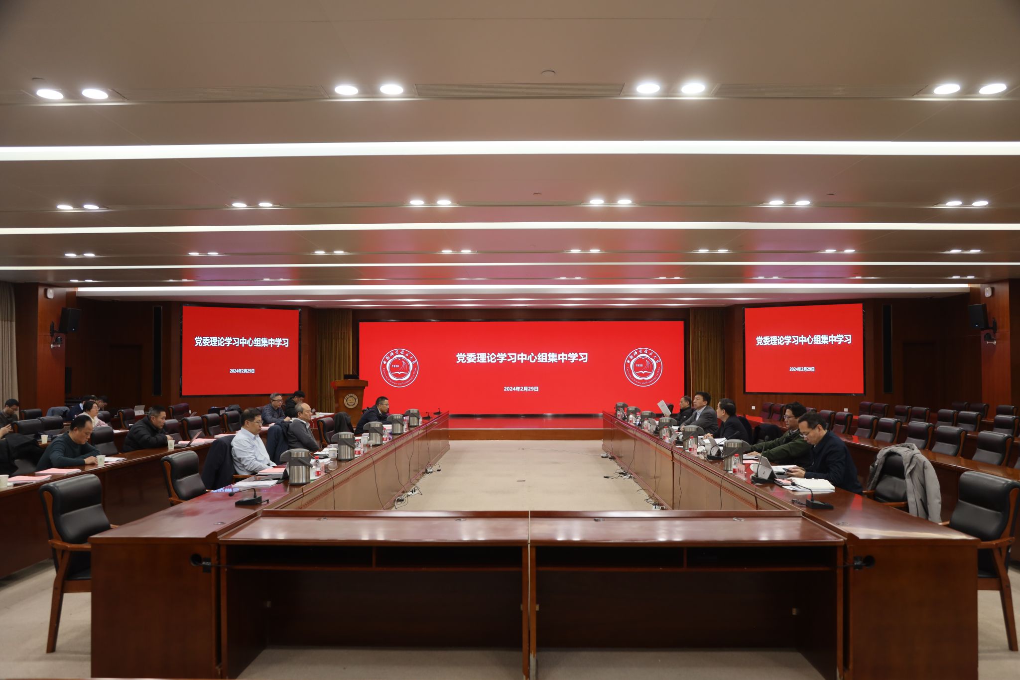 2月29日下午,校党委理论学习中心组在东活五楼报告厅召开2024年度第一次集中学习会。校党委书记舒歌群主持会议,校长包信和等在校校领导,党委委员、纪委委员,机关党群部门主要负责人参加会议。
