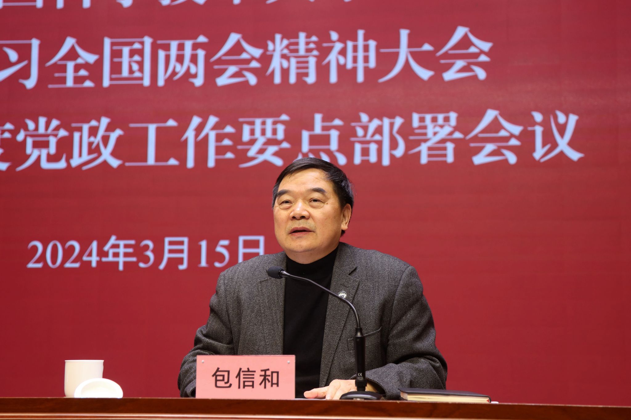 包信和指出,今年是中华人民共和国建立75周年,也是实现“十四五”规划目标任务的关键一年。学校要深入学习贯彻落实全国“两会”精神,牢牢把握高质量发展这个首要任务,聚焦“潜心立德树人、执着攻关创新”两大核心任务,坚持教育、科技、人才一体统筹推进,强化国家战略科技力量的责任担当,充分依托中国科学院发挥“全院办校、所系结合”特色优势,加强校地合作,积极融入长三角区域一体化发展和国家科教融合发展战略,因地制宜发展新质生产力,为加快推进教育强国、科技强国、人才强国建设贡献中国科大力量。