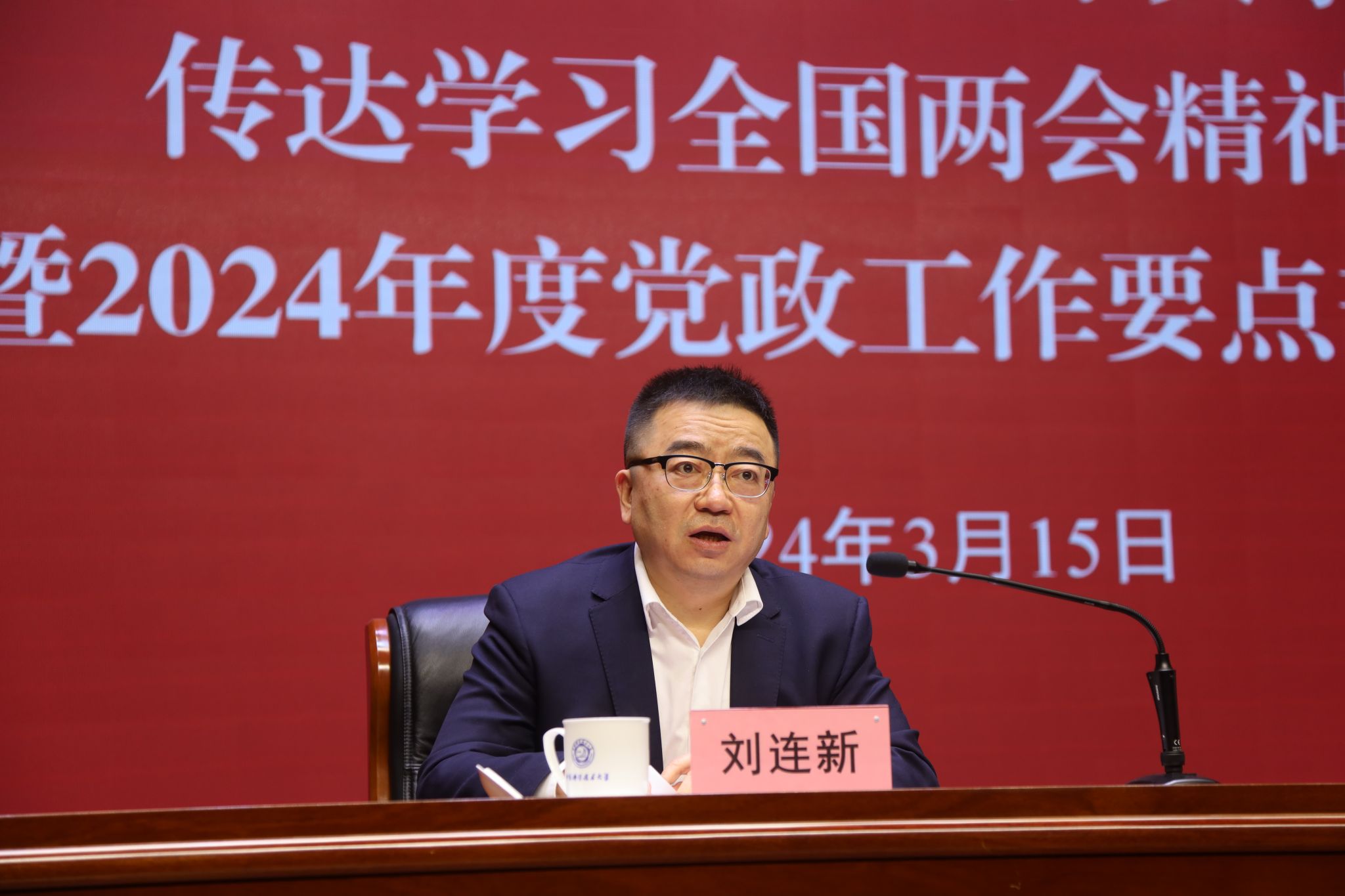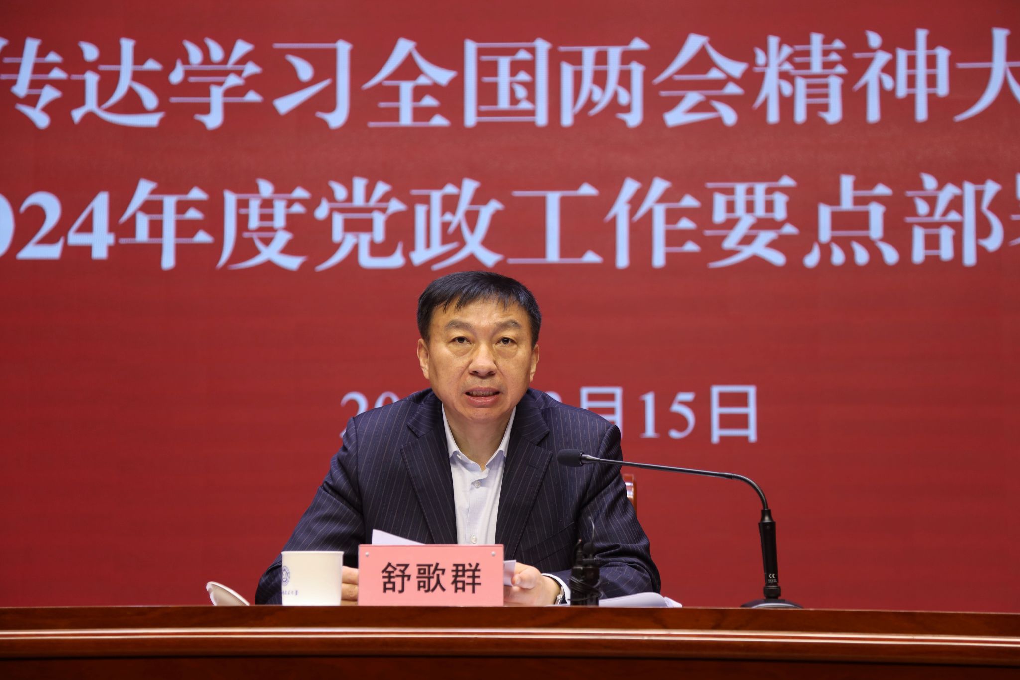 舒歌群指出,要把准重点方向,结合年度工作要点扎实落实全国“两会”各项部署,牢牢把握推动高质量发展这个首要任务,深刻领会因地制宜发展新质生产力这一重大论断,在推进“十四五”规划实施和“十五五”规划预研工作中全方位落实习近平总书记关于深化科技体制、教育体制、人才体制等改革的重要指示精神,着力破除教育、科技、人才等创新要素自由流动的体制机制障碍,打通束缚新质生产力发展的堵点卡点。全体党员干部要进一步提振干事创业的精气神,巩固拓展主题教育成果,锐意改革创新、敢于善于斗争,在直面问题、破解难题中不断打开工作新局面。全校科技工作者要进一步增强科教兴国强国的抱负,担当起科技创新的重任,坚持“四个面向”,加强基础研究和应用基础研究,把论文写在祖国大地上,把科技成果应用在强国建设、民族复兴的伟大事业中。