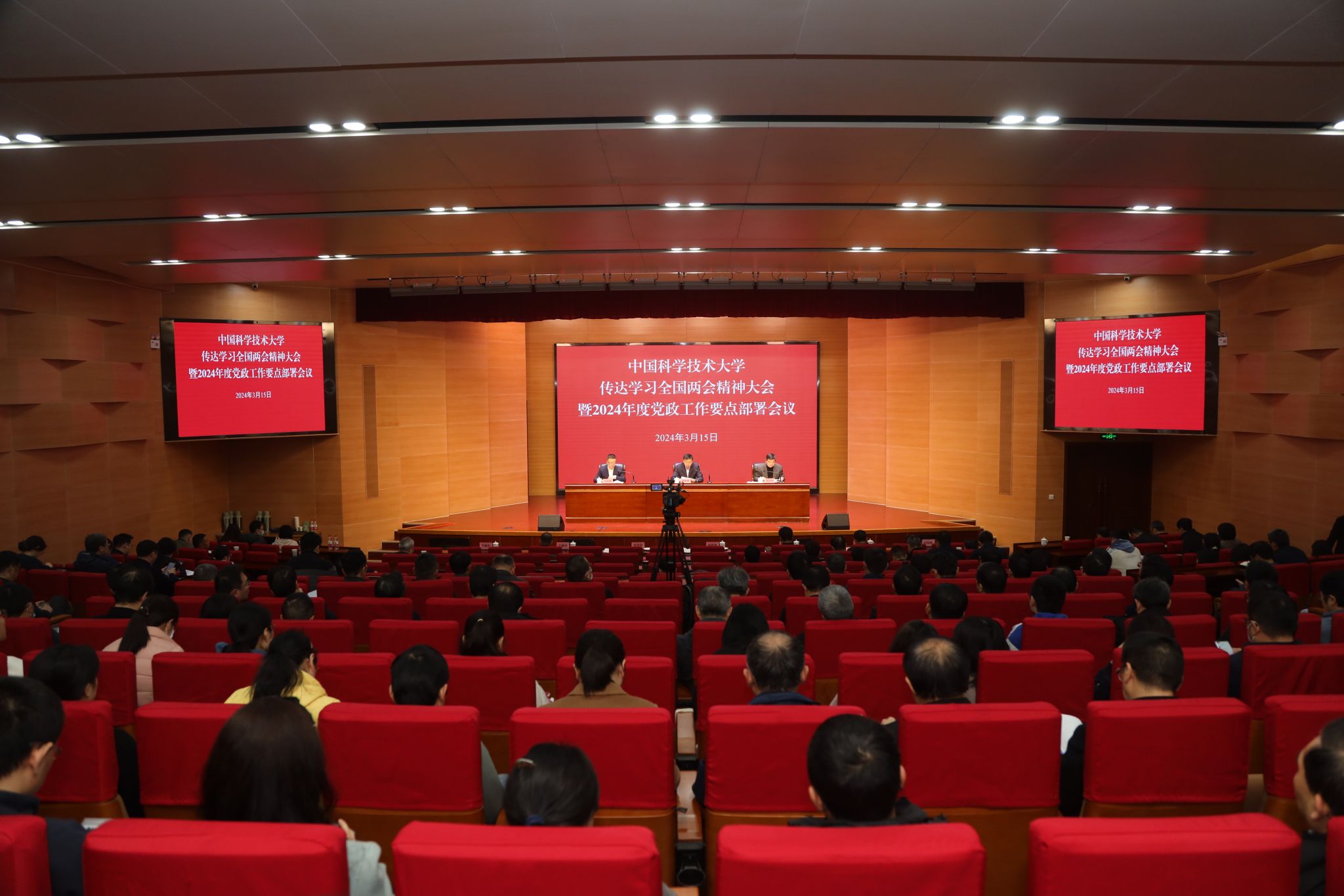 3月15日上午,中国科学技术大学全国“两会”精神传达学习会暨2024年度党政工作要点部署会议在东区水上报告厅举行。校党委书记舒歌群主持会议并传达习近平总书记在全国“两会”期间的重要讲话精神。全国人大常委会委员、校长包信和传达十四届全国人大二次会议精神并介绍安徽代表团参会情况,全国政协委员、附属第一医院(安徽省立医院)党委书记刘连新传达全国政协十四届二次会议精神并介绍住皖全国政协委员履职尽责、提交提案等情况。在校校领导,两院院士,校党委、纪委委员,全体中层干部,各民主党派负责人,教师代表,学生代表参加会议。