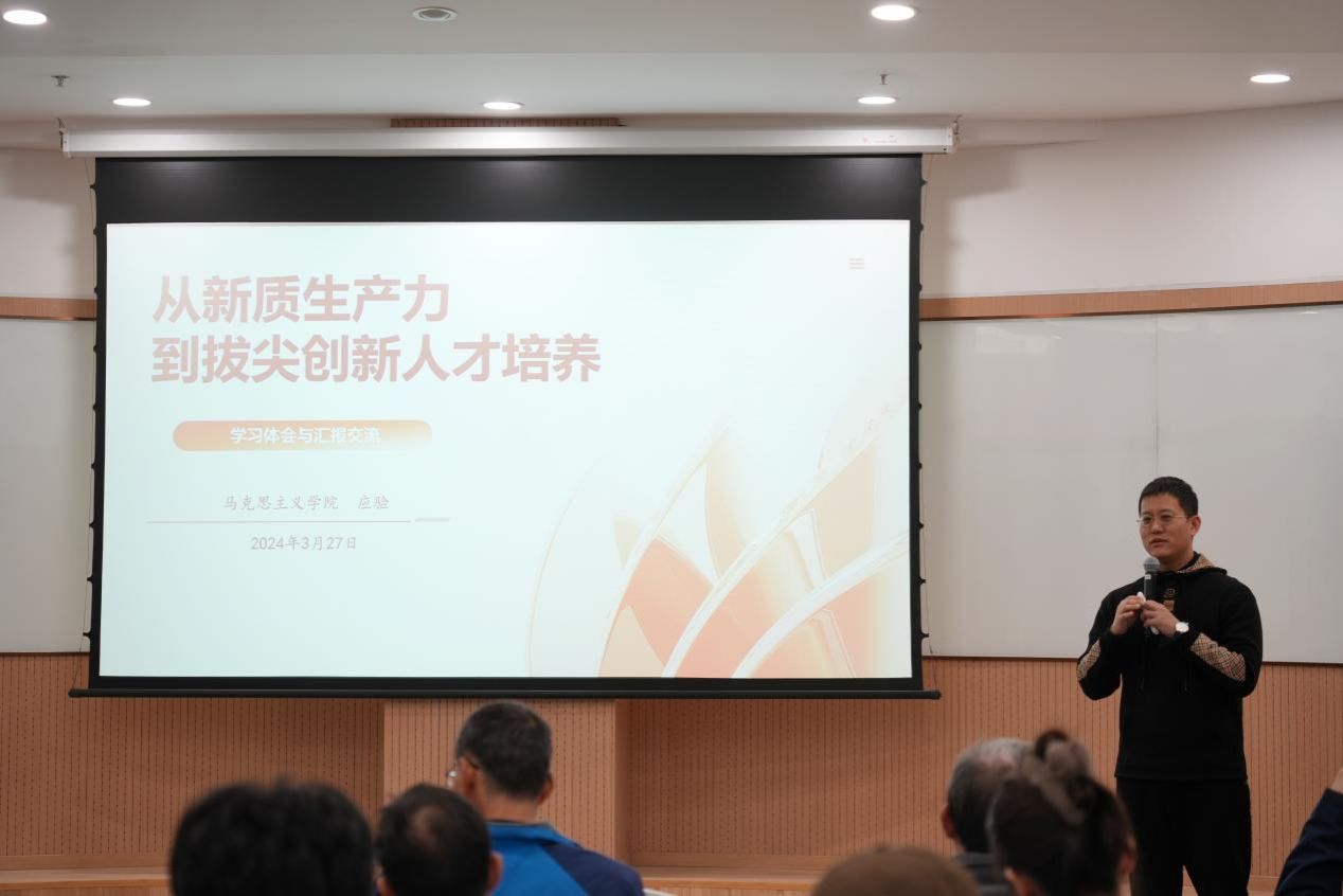 会议邀请了马克思主义学院教师应验为本科生院教职工做专题辅导报告。应验以《从新质生产力到拔尖创新人才培养》为题,围绕“新质生产力重要论述学习、新质生产力核心意涵阐释、拔尖创新人才培养探讨”三个方面展开。应验引用教育部部长怀进鹏在今年两会民生主题记者会上的讲话内容,说明了拔尖创新人才对于发展新质生产力的重要作用。最后,应验还提出了关于“扎根中国大地自主培养拔尖创新人才”的若干思考和建议。与会老师专注听讲,并认真记录。