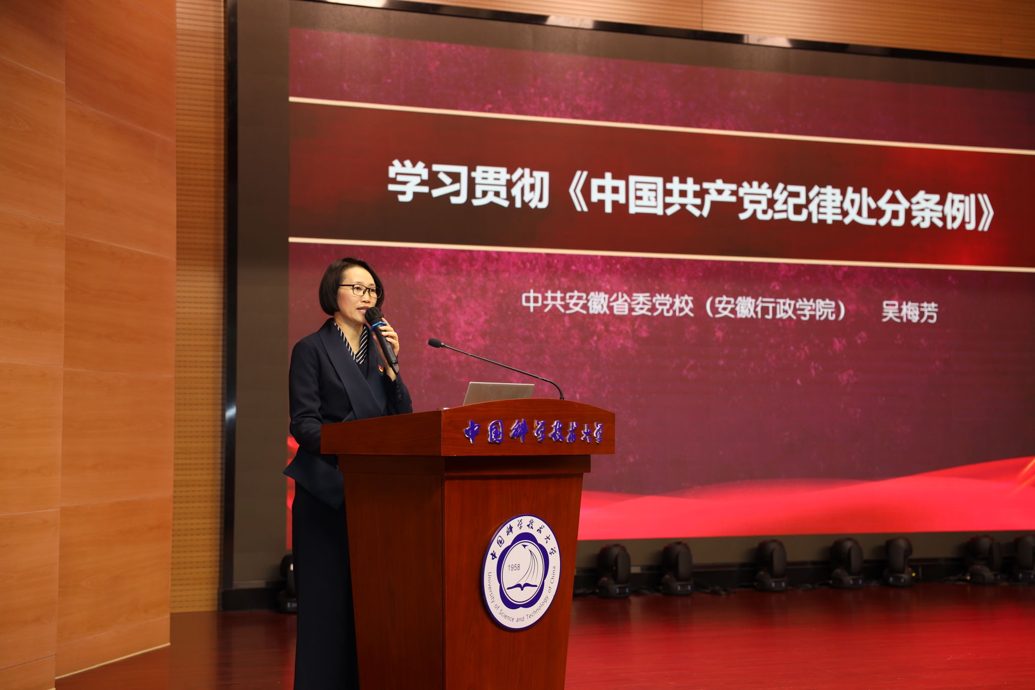 舒歌群指出,吴梅芳教授的辅导报告提纲挈领、精彩生动,给我们上了一堂生动的党课。在全党开展党纪学习教育,是以习近平同志为核心的党中央为加强党的纪律建设、推动全面从严治党向纵深发展的重要举措,是党的政治生活中的一件大事。当前,学校党纪学习教育已进入关键阶段,广大党员干部一定要深入学习贯彻习近平总书记关于加强党的纪律建设的重要论述和关于党纪学习教育的重要讲话重要指示精神,深入学习贯彻好《中国共产党纪律处分条例》,坚持逐章逐条学、联系实际学,抓好以案促学、以训助学,将纪律教育和党性教育、廉洁教育、理论教育贯通起来,以更高站位、更严要求、更实作风,高标准高质量推进党纪学习教育,引导党员干部真正把纪律规矩转化为政治自觉、思想自觉、行动自觉,为建设中国特色、科大风格的世界一流大学提供坚强政治保证。
