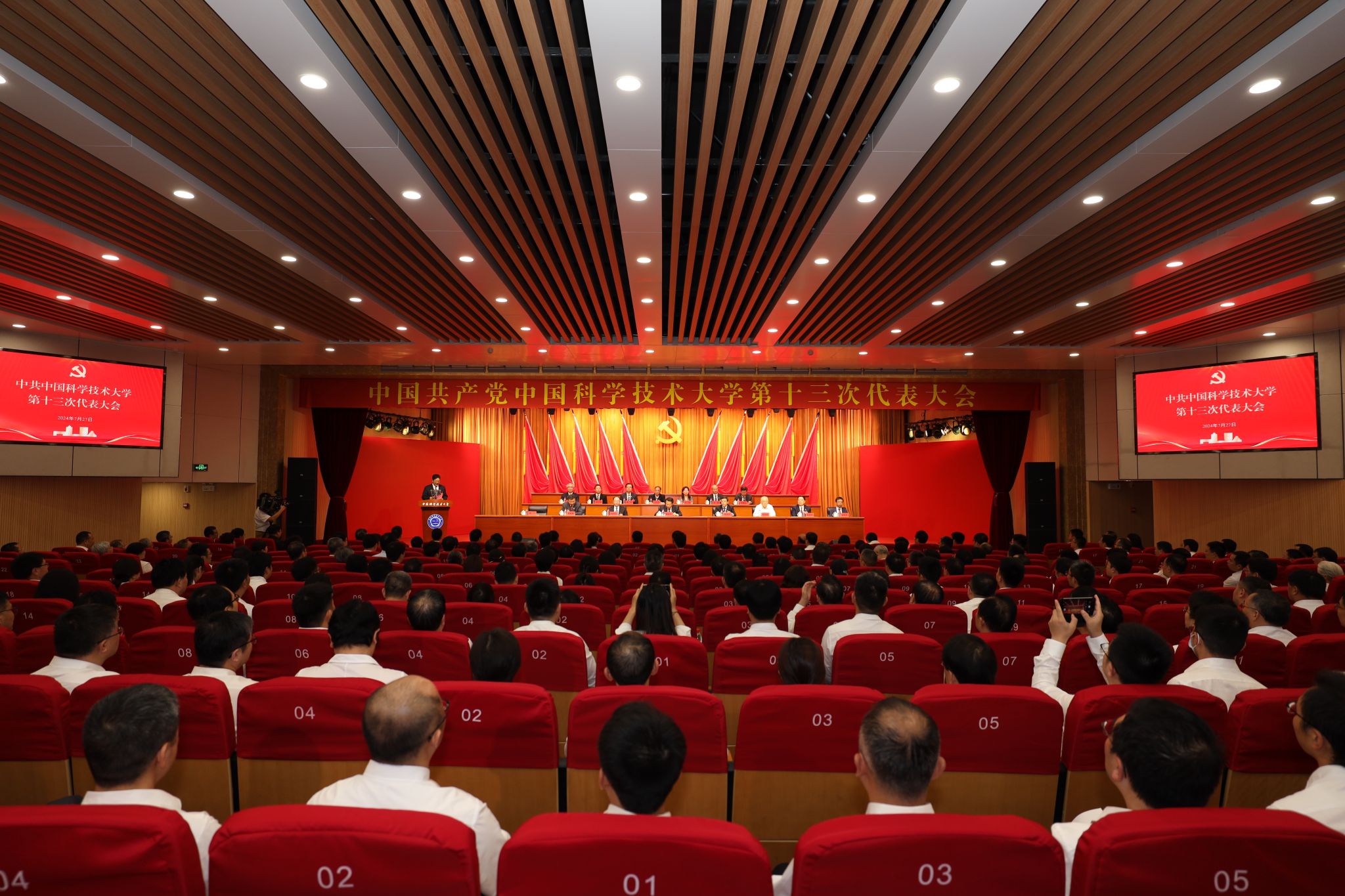 盛夏时节,万物葱茏。大礼堂雄伟庄严,会场内气氛热烈。主席台上方悬挂着“中国共产党中国科学技术大学第十三次代表大会”的会标,后幕正中是镰刀和锤头组成的中国共产党党徽,10面鲜艳的红旗分列两侧,党徽在鲜艳的红旗簇拥下熠熠生辉。