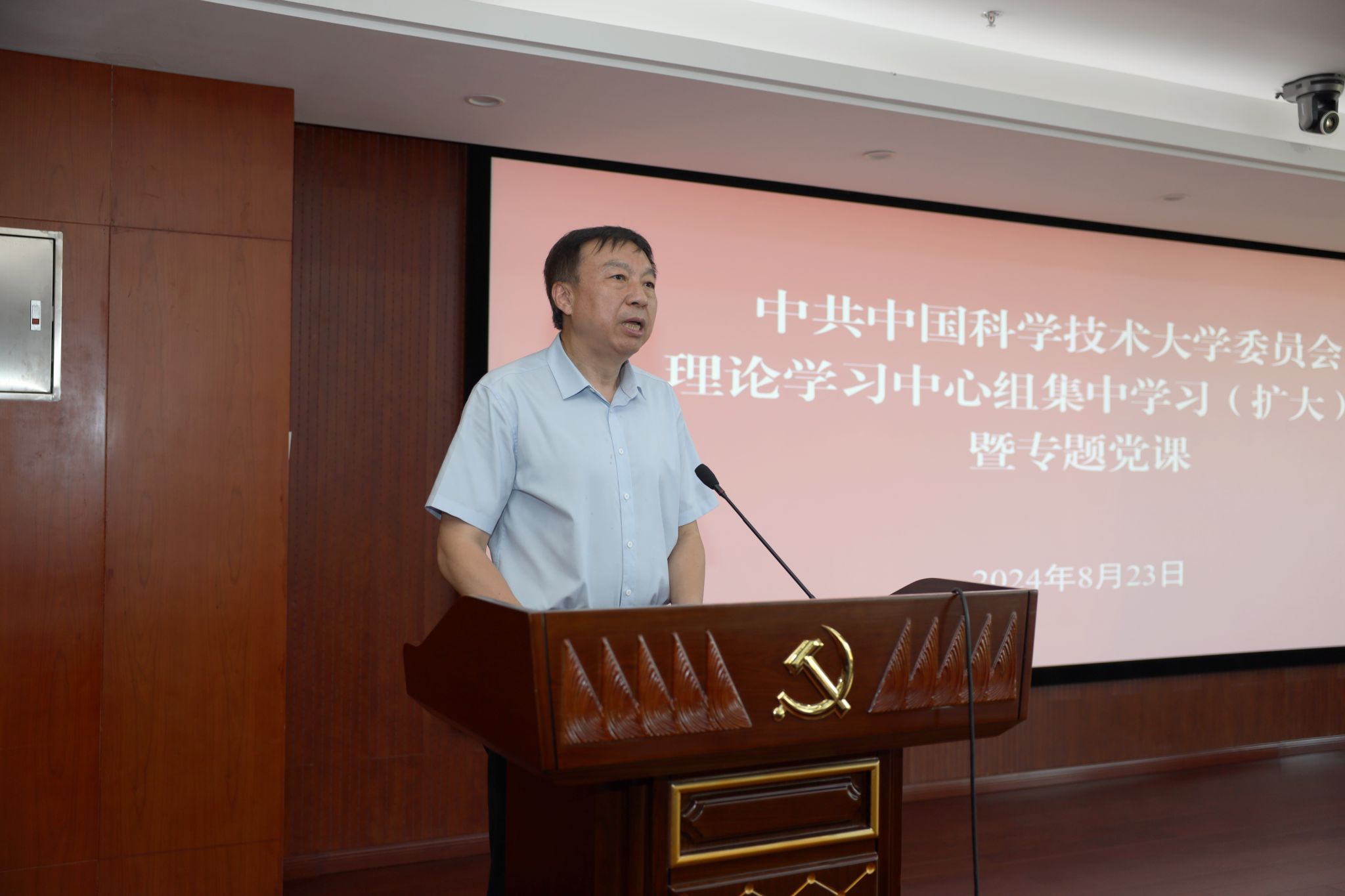 舒歌群指出,钱桂仑书记所作的专题党课报告系统全面阐述了当前教育改革的政治要求、历史定位、方向目标和实施路径,报告立意深远、主题鲜明、思路清晰、内容详实。学习贯彻落实党的二十届三中全会精神是当前和今后一个历史时期的重大政治任务,全体党员干部要切实把思想和行动统一到全会精神上来,对标对表党中央关于统筹推进教育科技人才体制机制一体改革新部署新要求,大力弘扬马克思主义学风,积极开展交流研讨,将理论学习与实际工作紧密结合,为进一步全面深化改革、推进中国式现代化贡献科大力量。