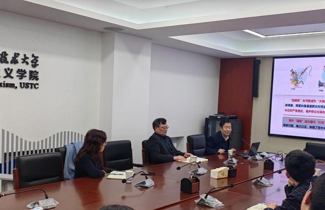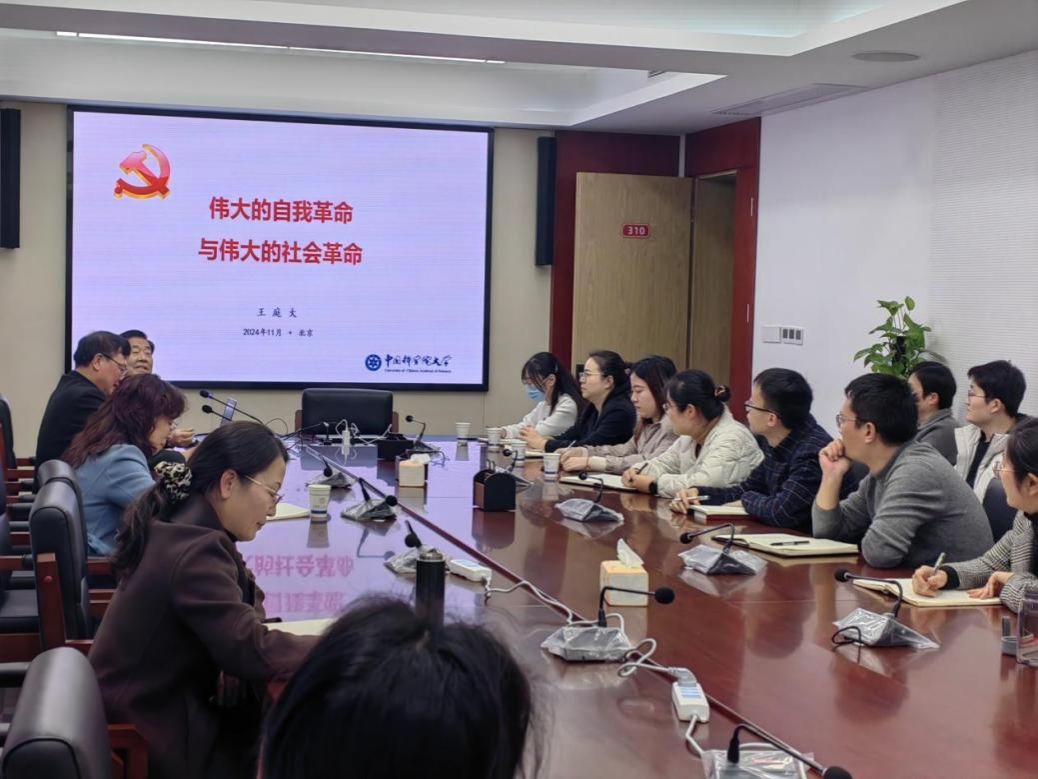 11月29日下午,中国科大“理实交融”马克思主义理论学科系列讲座第二十二期在马克思主义学院310会议室举行,中国科学院大学党史党建研究中心主任、研究员王庭大应邀作《伟大的自我革命与伟大的社会革命》专题报告。中国科学技术大学党委副书记、纪委书记、国家监委驻中国科学技术大学监察专员刘浏,马克思主义学院执行院长刘立教授、学术委员会主任魏荣教授、师生代表,以及校纪检监察机构工作人员参加报告会。报告会由刘立主持。