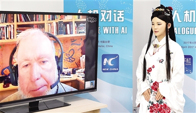 机器人佳佳通过网络与科技观察家凯文·凯利对话。 新华社发