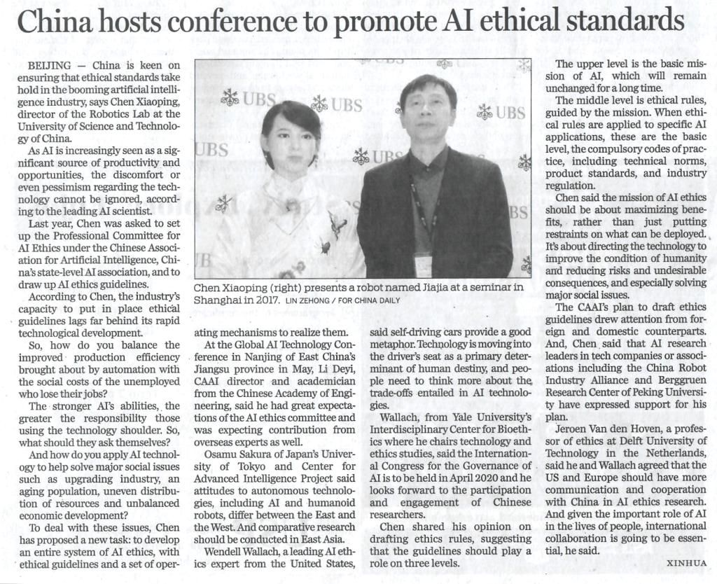 BEIJING - China is keen on ensuring that ethical standards take hold in the booming artificial intelligence industry, says Chen Xiaoping, director of the Robotics Lab at the University of Science and Technology of China.