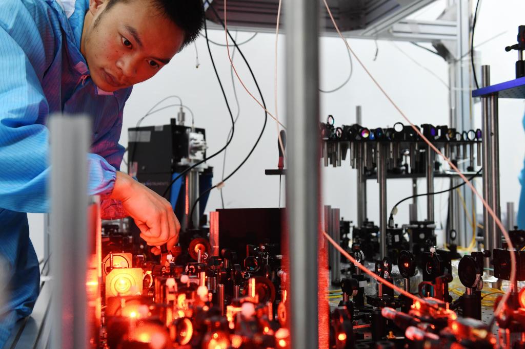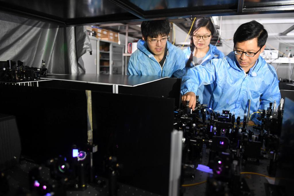 8月13日,在中科院量子信息重点实验室量子网络研究组,项国勇教授(右一)与科研人员调试量子资源转化实验光源。记者 徐旻昊 摄