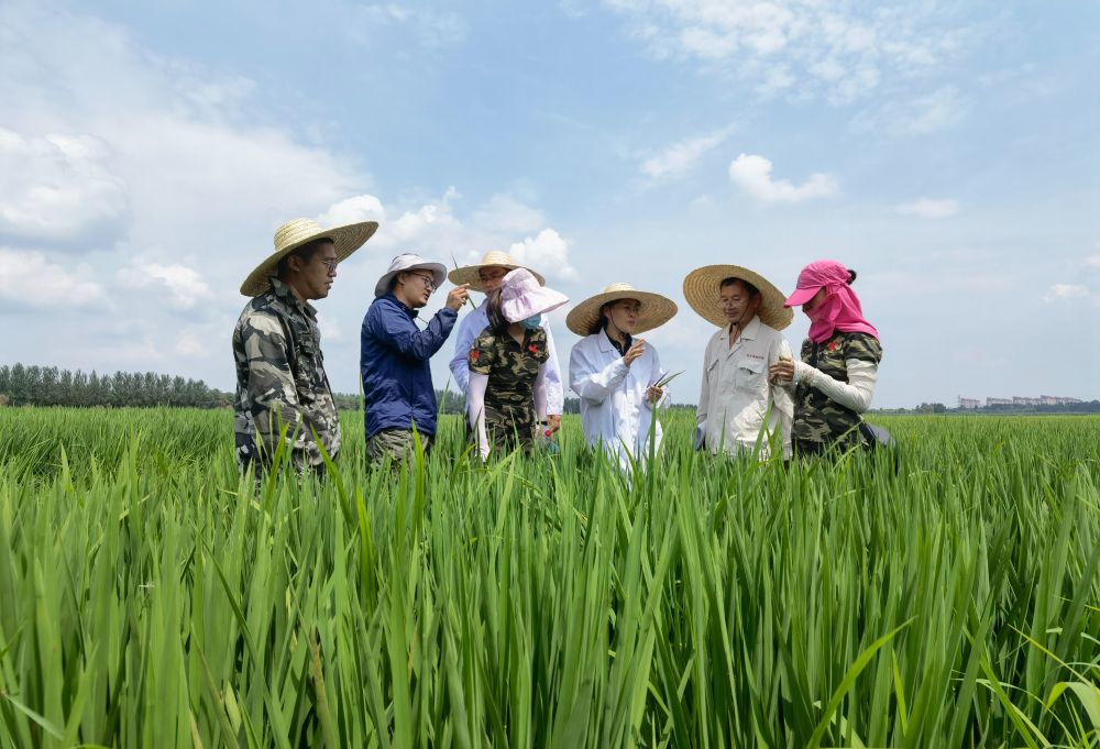 7月29日,辽宁省农科院水稻所研究员郑文静(右三)和团队成员在田间进行水稻抗病性调查。新华社记者 王莹 摄