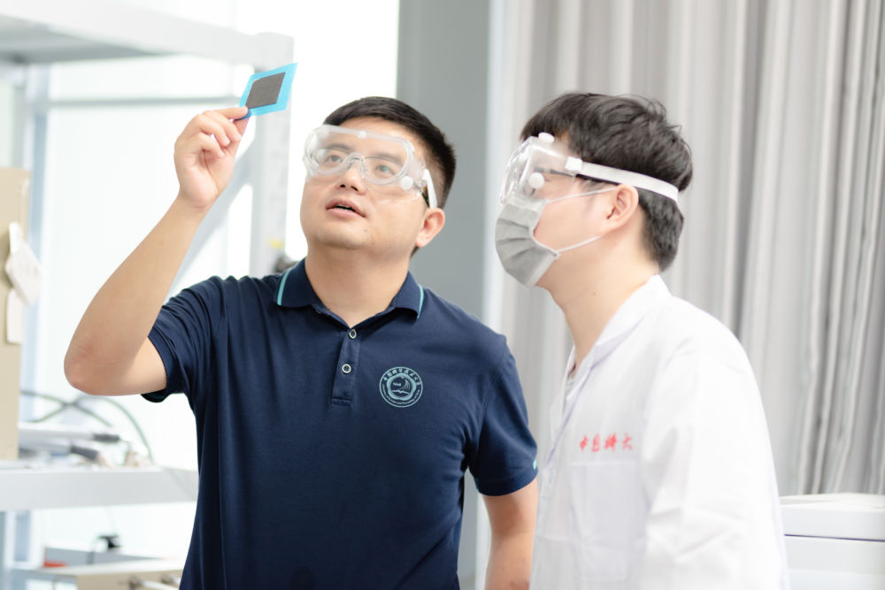 梁海伟教授(左)与团队成员测试氢燃料电池膜电极。新华社发(钱建豪摄)