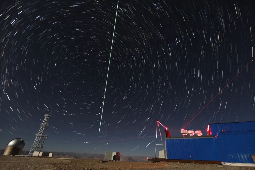 在西藏阿里观测站,“墨子号”量子科学实验卫星过境,科研人员在做实验(2016年12月10日摄,合成照片)。新华社记者 金立旺 摄
