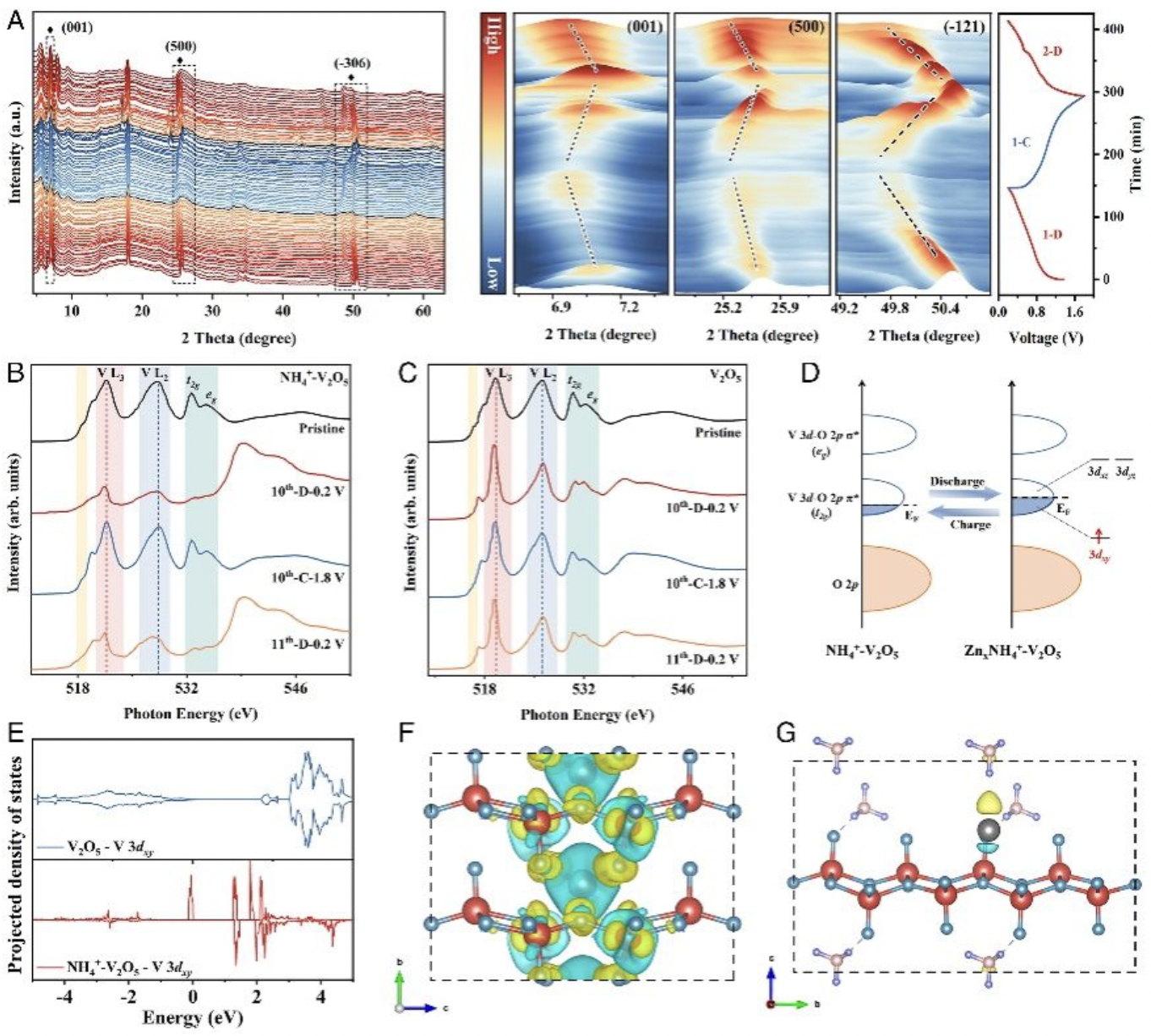 水系锌离子电池凭借安全、无毒,以及较高的理论容量,已经成为最具潜力的可持续储能技术之一。在众多水系锌离子电池电极材料中,层状钒氧化物具有晶体结构可调、容量高等特点,是现阶段广泛研究的正极材料。基于离子或分子预插层策略可以有效解决正极材料的晶格空间不足、电子传导性低等问题,从而进一步提升电池性能。然而,目前对插层型正极材料的研究多关注于层间空间膨胀对容量的贡献。因此,发展先进的原位表征技术,从原子轨道方面深入理解由插层剂引起的电极材料内在结构变化是未来高性能正极材料设计和开发的关键所在。