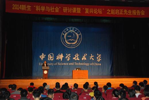 10月25日上午,新生“科学与社会”研讨课主题报告暨“复兴论坛”系列讲座之三十八讲赵启正先生报告会在科大东区大礼堂举行,58级校友赵启正先生作客中国科大,为我校2014级本科新生作题为《时代的呼唤》的精彩报告。副校长陈初升教授主持本次报告会。