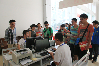 由于学校继续推行新生入学程序网络化,许多新生在到校之前已经通过本科生迎新系统完成了个人信息填写、费用缴纳等报到项目,约有近1500名同学已提前完成缴费,现场缴费的同学只有几百人。往年出现在新生报到点的“户籍办理”、“军训服装发放”等项目,今年改至8月17日进行,届时将以班级为单位组织新生完成。这些举措简化了报到流程,极大地节约了新生现场报到的时间。
