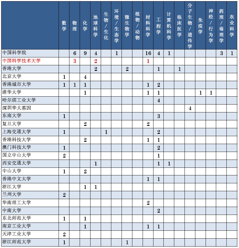 我校物理领域有3人入选,占中国(14人)的21%;地球科学领域有2人入榜选,占中国(10人)的20%;入选人数均列全国高校第一。下表列出了部分中国科研机构的入榜人次和领域。