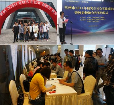 作为“万名硕博常州行——名校学子看龙城”活动内容之一的“研究生社会实践对接会”在常州市创意产业基地召开,常州市54家知名企业与我校等九所高校的研究生对接洽谈,提供研究生社会实践和招聘需求职位580多个,参会单位主要涉及机械制造、电子信息、新能源和新材料、石油化工、生物医疗等。