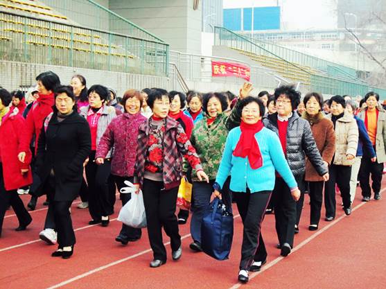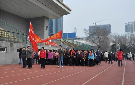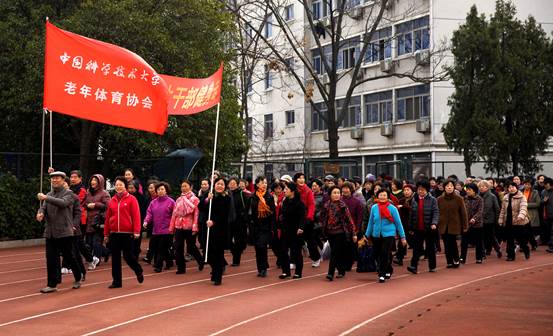 九点整,随着发令枪响,运动员进行曲奏起,健身走队伍在老年体育协会会旗和“中国科大离退休干部迎新春、庆三八健身走”的横幅引领下,列8个纵队沿操场慢步行进。900余名老同志宛若一条长龙,甚为壮观。
