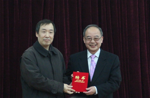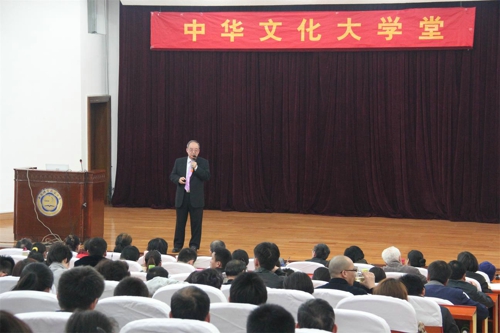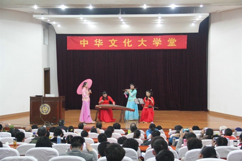 中华文化大学堂本学期首场讲学活动于3月16日下午在校水上报告厅如期举行。本次讲学活动分为专家讲座、才艺展示和海峡两岸文化对话三部分。我校师生及各界中华文化爱好者300多人参加,全场座无虚席,后排还有许多站立的听众。报告开始前,人文学院党委书记潘正祥向朱荣智教授颁发了中华文化大学学术与教学委员会委员聘书。