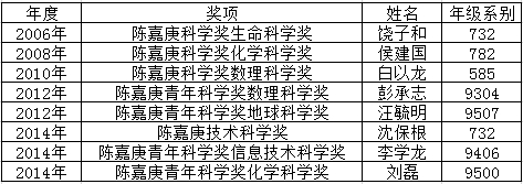陈嘉庚科学奖和陈嘉庚青年科学奖自成立以来,已在我国科技界和海内外产生了崇高的声誉和广泛的影响,对促进我国科学技术的创新与发展起到了很好的激励与推动作用。2006-2012年,我校共有5位教授和校友获奖,其中饶子和(732)、侯建国(782)、白以龙(585)获陈嘉庚科学奖;彭承志(9304)和汪毓明(9507)获首届陈嘉庚青年科学奖。