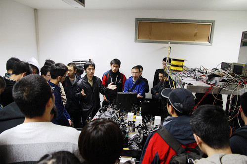 24日上午,清华师生们参观了微尺度物质科学国家实验室量子物理与量子信息研究部。研究组组员详细介绍了实验室的部分科研仪器与研究成果,并热情解答了在场学生的提问。