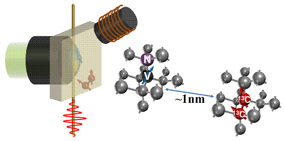 中国科大杜江峰研究组及其理论合作者利用掺杂金刚石中氮-空位固态单电子自旋量子干涉仪,成功在室温大气环境下实现了单核自旋对的探测及其原子尺度的结构分析。此成果发表在《自然-物理》上[Nature Physics, AOP: 24 Nov. 2013, DOI: 10.1038/NPHYS2814]。