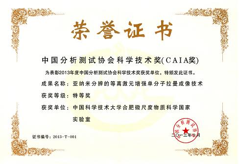 CAIA奖作为国家承认的由社会力量设立的唯一科学技术奖,正越来越受到我国分析测试领域广大科技工作者的关注和欢迎。该奖设立于1993年,每年评审一次,用于奖励高水平的分析测试成果,其中特等奖授予“具有国际领先水平或特大社会经济效益”的重大成果,20年来仅有6项成果获得了CAIA特等奖。2001年,我校理化科学中心侯建国、王海千、杨金龙等教授的“单分子扫描隧道显微技术”曾获得CAIA特等奖。CAIA特等奖自2001年已连续空缺11年,今年我校“亚纳米分辨的等离激元增强单分子拉曼成像技术”和军事医学科学院“化学反恐怖筛查确证关键技术研究及应用”获特等奖,目前我校是国内唯一两获此殊荣的单位。
