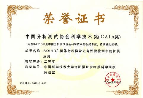 此外,在今年的CAIA评奖中,合肥微尺度物质科学国家实验室除获特等奖外,实验室的赵继印、石磊、周仕明、郭宇桥申报的项目“SQUID在固体材料异常磁电性能检测中的扩展应用”还获二等奖。