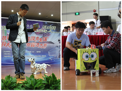 每一队表演完,观众的热情也会通过现场噪音分贝仪表现并计入成绩。近代力学系队“果果”机器狗的表演无疑成为20日上午的第一个小高潮,它赢得了全场观众的最高分145分。果果不仅能实现一般机器狗的防盗、取物、天气预报等功能,由于拥有高度自由的四肢设计,还可以做俯卧撑,它边做边数数,在做了6个后,很可爱地发出一句“我累了,休息一会”,引得在场观众笑声连连。之后它便伴随着舞曲《江南STYLE》开始手舞足蹈起来。一连串的表演后,记者听到身边一位小学生对妈妈说,“妈妈我们回去也买一个吧!”