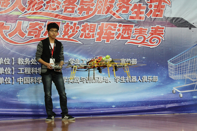 上午家用机器狗比赛最后出场压轴表演的是物理系队带来的一只会飞的机器狗“天狗”。它耗时9个月,由四个圆轮组合而成,对角长度有1.2米,只见它在台上上天下地、左右摇摆无所不能,它随身携带2个摄像头,能实现航拍功能。“这2个摄像头一个负责定位,一个负责拍摄,在飞行过程中实现人脸识别,然后发送到远程电脑上。”队长徐浩介绍说,“‘天狗’的起飞降落使用图形定位,在空中使用GPS定位。我们希望未来能够实现小区实时监控。”台下观众看完后都惊呼“太神奇了”,纷纷表示没看过瘾。